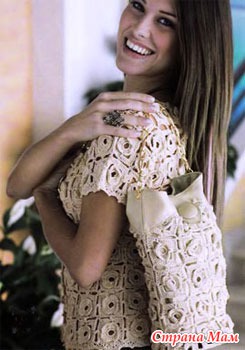 Вам потребуется:: 150 г для жакета и 150 г для сумки бежевой пряжи MONDIAL CABLE 5 (100% хлопка, 200 м/50 г); крючок №1,75; 6 пуговиц; металлическая цепочка (ручки); ткань для подкладки; кожа для сумки; штопальная игла.