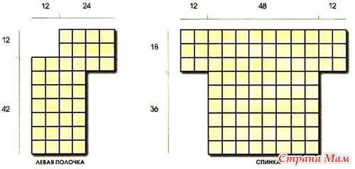 Выполнение работы: связать 160 квадратных мотивов и соединить их друг с другом мелкими стежками, как показано на выкройке полочки и спинки. Так же мелкими стежками выполнить плечевые и боковые швы и швы рукавов. Обвязать нижний край жакета, центральные края полочек, горловину и края рукавов следующим образом. 1-й р.: * в 1 п. связать 1 ст. с/н, 1 возд. п. и 1 ст. с/н, пропустить 1 п. *, повторять от * до *, 1 соед. ст. в 1-ю п. ряда; 2-й р.: * по 1 ст. б/н в каждый из следующих 6 ст. с/н предыдущего ряда, в 7-й ст. с/н вязать 1 ст. б/н, 1 возд. п. и 1 ст. б/н *, повторять от * до *, соед. ст. в 1-ю п. ряда; обрезать и закрепить нить. Пришить пуговицы.
