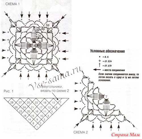 Модель собрана из отдельных мотивов квадрат (схема 1) и треугольник (схема 2) в последовательности, указанной на рис. 1. Число рядов и, соответственно, размер изделия определите индивидуально. Каждый фрагмент начинайте с цепочки из 14 в. п., замкнутой в круг полустолбиком.