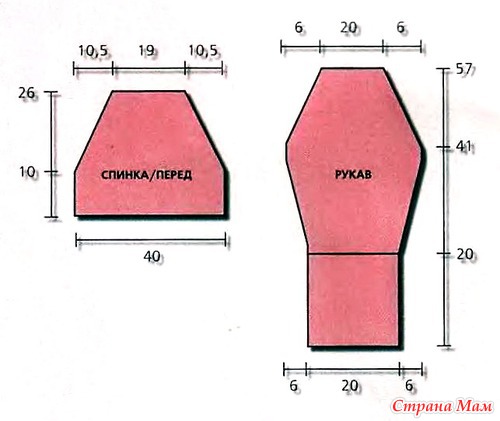 Спинка/перед: на спицы № 5 набрать 66 п. и связать 6 р. двойной резинкой. Перейти на спицы № 6 и вязать резинкой 3/2. Через 10 см для скосов реглана убавить с обеих сторон в каждом 2-м р. 17 х 1 п. Через 26 см закрыть оставшиеся 32 п.