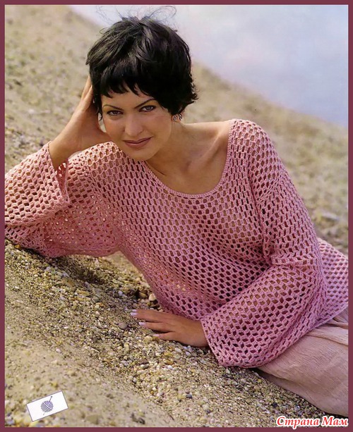 Выполнить плечевые швы. Края выреза горловины обвязать отделочным узором. Выполнить боковые швы и швы рукавов. Вшить рукава.