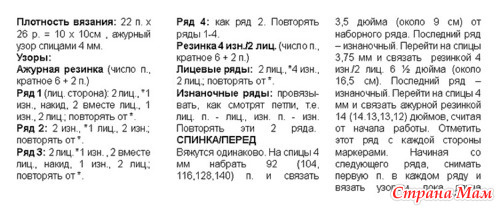 Рукава: на спицы № 5 набрать 41 п. и связать 6 р. двойной резинкой и 40 р.