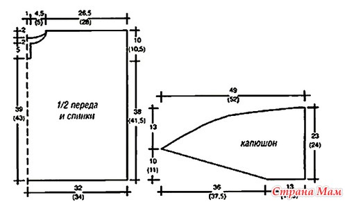 ного края закрыть с левого края для закругления капюшона 8 каждом 2-м р. 2 (1) х 2.2 (3) х 3.2 х 4.3 (2) х 5.2 х б. 0(1) х 7и 1 х 8п. Через 23 (24) см от наборного края закрыть оставшиеся петли прямо. Вторую деталь связать аналогично.