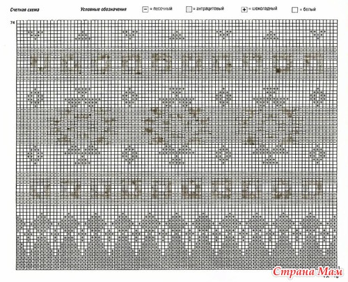 Вам потребуется: 300 (350) г песочной. 200 (250) г белой. 150 (200) г шоколадной и 150 г антрацитовой пряжи Polarе (63% полиакрила. 30% шерсти. 7% полиэстера. 55 м/ 50 г) или Boston (70% полизкрила. 30% шерсти. 55 м/50 г): спицы № 5.5 и № 6
