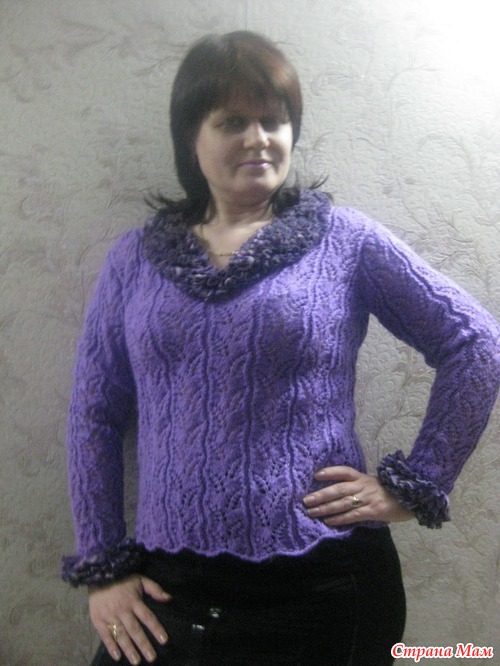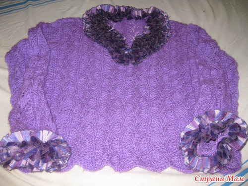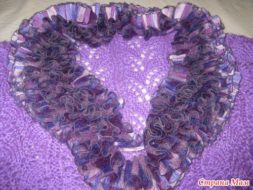 да, долго мучалась с рюшами, все не могла никак их ввязать, не получалось сразу ввязывать, пробовала потом на готовый свитерок, тоже не получилось как хотелось, пришлось вязать их отдельно и пришивать, но мне не нравится, буду пробовать еще переделывать горловину, немного стянуло вырез, нужно длиннее рюши сделать