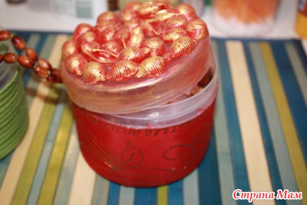 Обклеиваем подходящей тканью баночку и рисуем все, что придет на ум. Крышку промазываем клеем и раскладываем макароны-ракушки. Когда все приклеится, аккуратно раскрашиваем красками. Мало кто догадывается , что это макароны