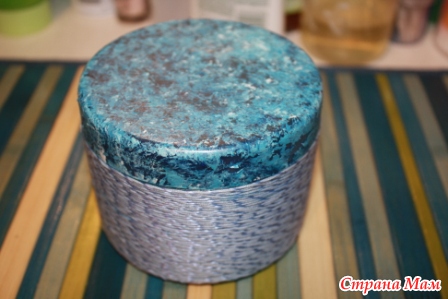 Обмотали нитками ровно-ровно, промазывая баночку клеем ПВА, а крышку расписали акриловыми красками.