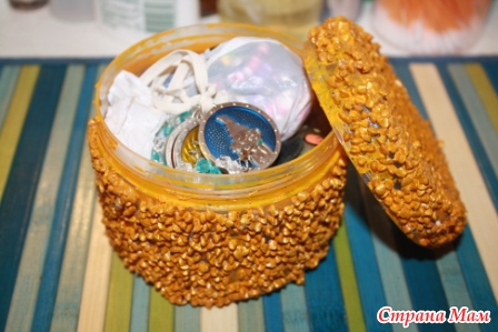 Был выходной день и жутко холодно на улице, так что прогулка отменилась. С детём устроили уборку и нашли запрятанные мною пластмассовые тары с завинчивающимися крышками из-под маски для волос. Вот и нашли себе интересное занятие!. Устроились на кухне, достали всякие нитки, акриловые краски,клей ПВА и еще макароны и гречку. Через пару часов увлеченной работы получились симпатичные шкатулки для мелочей.