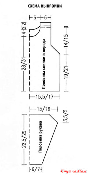 Перед: вязать таким же образом, как и спинку, только на высоте 28 (31) см от наборного края формировать линию выреза горловины. В середине закрыть 16 петель, затем убавить еще 4 раза по 2 п., 2 раза по 1 п. До линии плеч вязать по прямой, затем все петли закрыть.