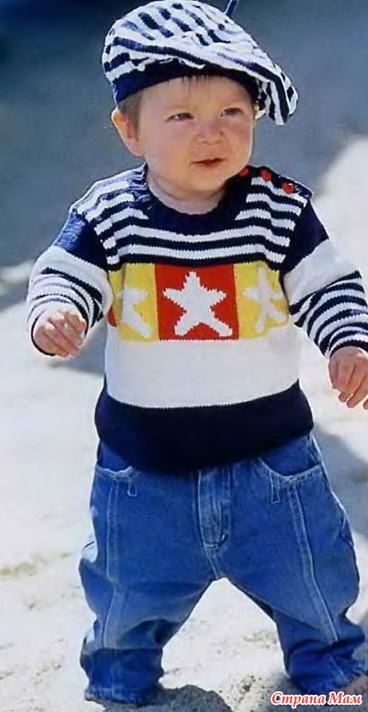 Спинка: набрать 95 (105) п., цвет пряжи синий, вязать узором "резинка". Вязать 34 (40) рядов синим цветом, затем 34 (40) рядов белым цветом, 33 ряда узором "звездочка". На высоте 19 (21) см от наборного края начать формирование проймы, убавить по 4 п. на каждой стороне в каждом третьем ряду. Далее до линии выреза горловины вязать прямо. В середине закрыть 16 петель, на каждой стороне убавить 4 раза но 2 п., 2 раза по 1 п. На правом плече закрыть все петли, на левом вязать еще 2 см и формировать петли для пуговиц. После узора "звездочка" вязать полосками.