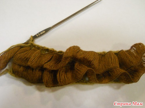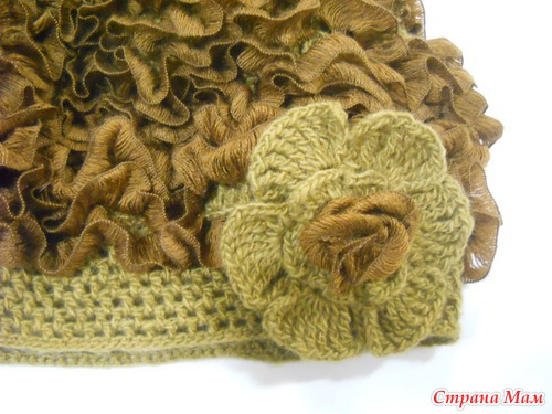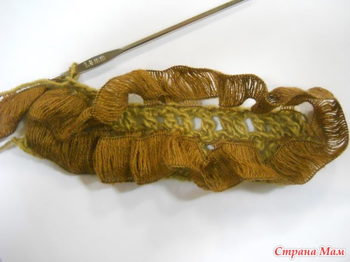 3ряд столбик с 1 накидом 1 воздушка, во 2-ой столбик добавляем ленточную пряжу и двумя нитками провязываем 1 воздушку, затем снова столбик с 1 накидом 1 воздушка и опять во 2-ой столбик добавляем ленточную пряжу. Если вы хотите пышнее воланы то ленточную пряжу провязываем в каждый столбик с накидом, но здесь все на усмотрение самой модели. Лично я провязав половину берета в каждый столбик, распустила.
