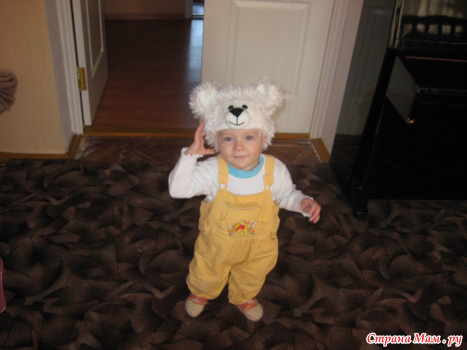 Теперь продолжила вязать травкой . Вязала до лица и возвращалась, каждый раз заципляя за лицо, а можно нитку пускать за лицом и вязать по кругу. В результате у меня получилась шапочка. Мордашку вязала аналогично ( по кругу с прибавлениями, до нужного размера, а потом без прибавлений и она закруглилась), пришила к шапочке. На ней вышила нос и рот, преклеяла глаза. Ушки - просто кружочки нужного размера.