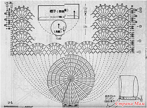 Рабочую нить привязываем к краю кружка (стрелка на рисунке) и обвязываем затылочную часть чепчика по схеме.