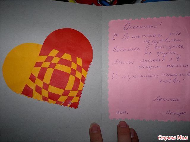 Свечка в форме сердечка... пахнет вкусно... чем именно не поняла. А какая открытка ручной работы... мммммм... с СИСЕЙ(доча так сказала)... а внутри теплые слова и сердечко красивучее...(Оль научи так делать).