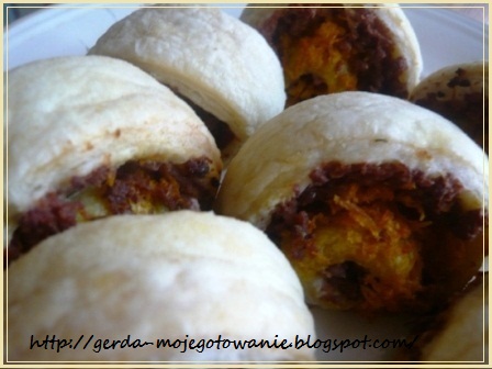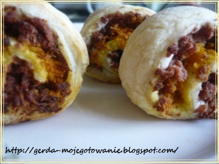 Тесто разморозить, немного раскатать. Сверху выложить фарш, посыпать спциями и свернуть в рулет.