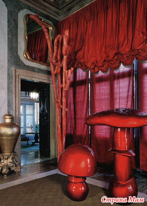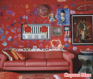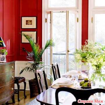 Насыщенный, чистый красный подавляет другие цвета интерьера, если им покрыты большие плоскости; но вводимый дозировано, в виде отдельных цветовых пятен на стенах, в драпировке, на подушках, в аранжировке цветов, он поднимает настроение, дает заряд бодрости.