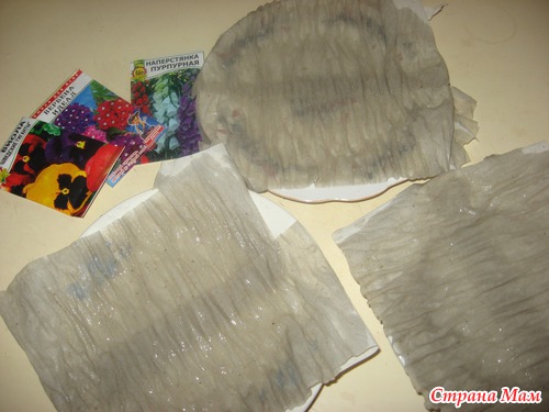 Закрываем все пленкой пищевой или же просто пакетом, к сожалению именно это я не сфотографировала... Под пленкой держим около трех дней после чего пленку убираем, семна прорастут корешками в бумагу, через пару дней семена можно высаживать, аккуратно потянув за стебелек.