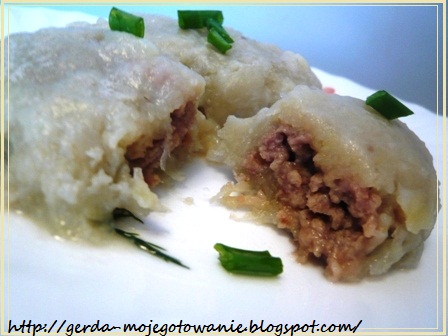 Из картофельной массы слепить несколько лепёшек, внутрь каждой вложить фарш и свернуть в виде цеппелина (пирожка). Опускать цеппелины в кипящую подсоленную воду по одному, помешивая.