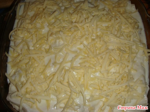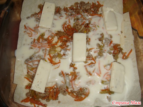 последний слой лаваш, поливаем соусом и посыпаем сыром