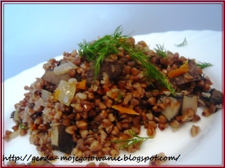 Смешать с гречей, обжарив всё вместе ещё пару минут.