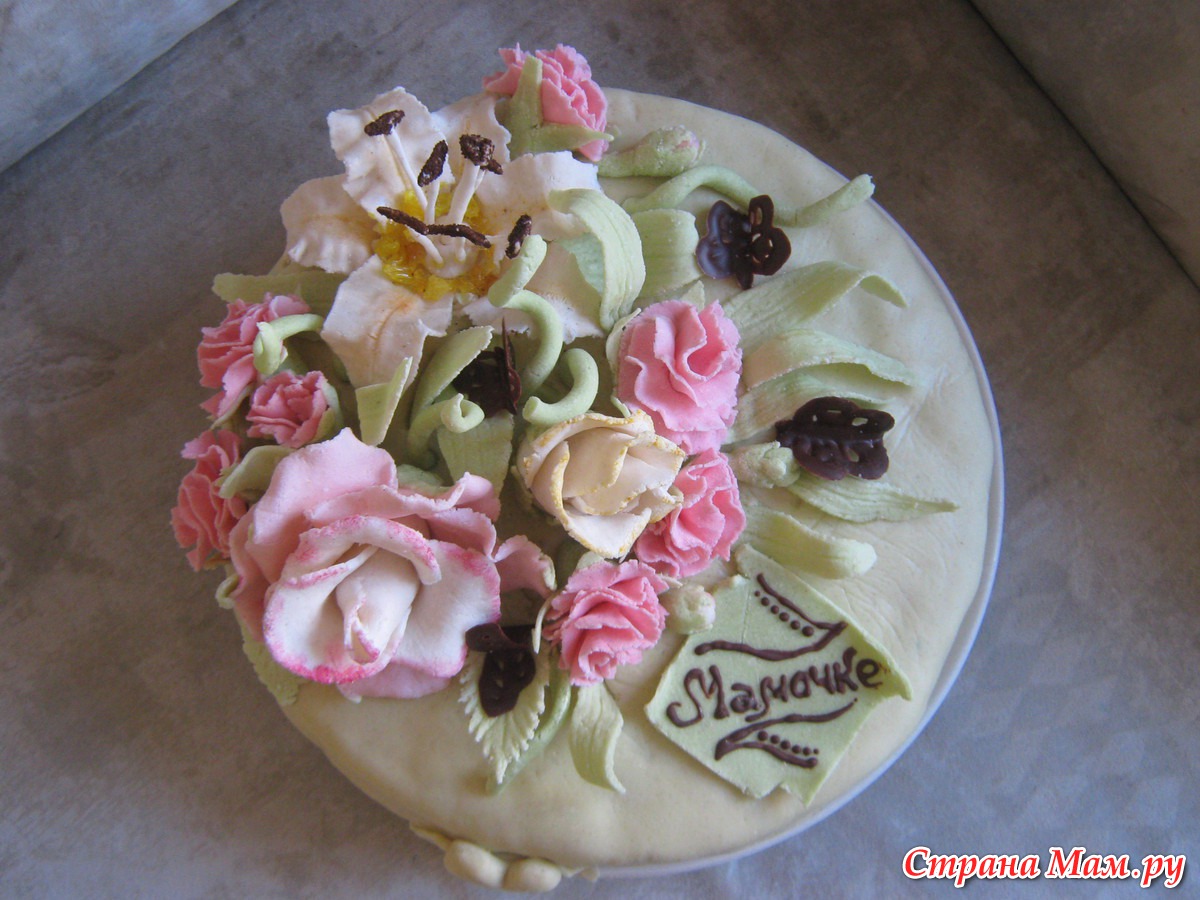 А вот и мой долгожданный тортик маме на День Рождения. Целый месяц вычитывала МК, лазила по нету, смотрела фотки, потом все понравившееся лепила и в уме составляла. Наконец, сегодня вылепила. Спасибо большое всем мастерицам, потому что много фоток и МК смотрела, брала идеи. Вот что получилось в итоге