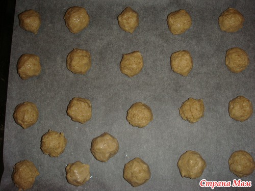 масло растереть с сахаром, добавить яйца, овсянку, соду, муку - хорошо перемешиваем, в пакет и убираем на 1 час в холодильник. Достаем делаем шарики с грецкий орех (я наливаю в контейнер воду, смачиваю руку, чайной ложкой набираю тесто, скатываю шарик - так тесто не липнет к рукам), выкладываем на противень и в духовку