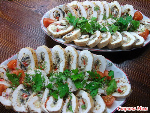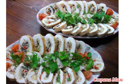 Блюдо однозначно радует глаз и желудок. Обычно на столе после празднества, ну хоть что-то остается. Что-то и осталось (колбасная нарезка), а вот рулетики ушли все до единого. Смело могу рекомендовать, как праздничное блюдо и шикарную закуску. Скоро 23 февраля и 8 марта. Думаю, с начинкой можно экспериментировать. Но мне нравится именно так... ну куда уже лучше??? Подавала холодным. Но думаю, можно было и подогреть в микроволновке при желании.