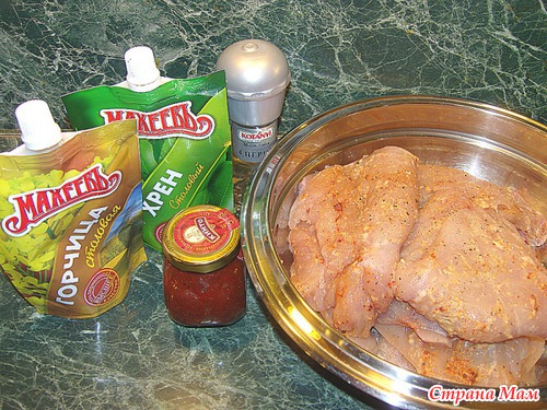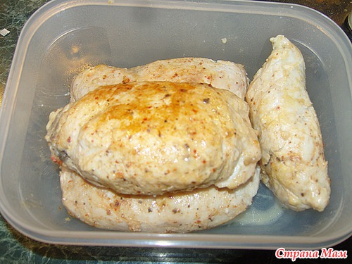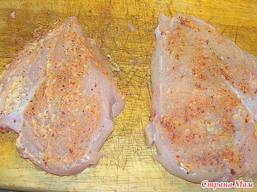Каждую грудку, я любовно обмазала с обоих сторон острой смесью (горчица, хрен, и аджика). Мы любители острой кухни. Грудки соответственно, отбитые. Тут же посолила каждую сторону. Отложила в сторонку. Пусть лежат и пропитываются...