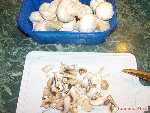 Режем свежие шампиньоны. И обжариваем их на сковороде с луком репчатым. На сливочном масле.