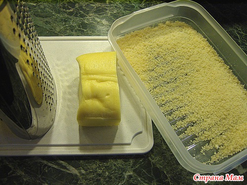Отдельно готовлю смесь сыра и чеснока рубленного. У меня два сыра. Пармезан и Гауда. Заливаю майонезом домашним. Слегка.