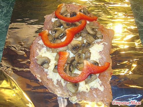 Теперь на толстой фольге, на грудку складываем слои: сырная смесь, грибы и для цвета (иначе бледные получатся) красный болгарский перец. Можно добавить зелени, но я предпочитаю ей украшать, а не ставить на тепловую обработку.