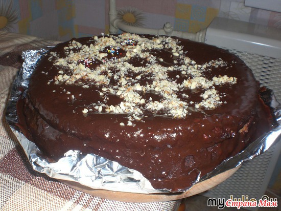 Два яйца, два стакана сметаны, два стакана сахара, сода и уксус - перемешать и три стакана муки тесто пополам. В одну часть - одну столовую ложку какао. Испечь две пышки. Разрезать пополам. Крем: один стакан сметаны домашней или 300 грамм масла и один стакан сахара и два яйца. Взбить до воздушности и 0.25 стакана сваренного, остуженного черного кофе. Размешать хорошенько. На верхний корж - глазурь: два столовая ложка молока и четыре столовая ложка сахара и три чайные ложки какао сварить, и 50 грамм сливочного масла.