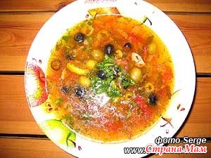 Перед подачей в тарелочку кладем оливочку, ломтик лимончика, сметанку, и наливаем солянку.