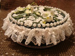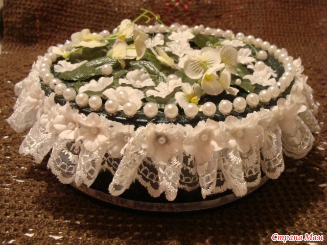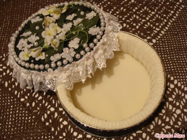 Банка от печенья оклеивается однотонной салфеткой(клей ПВА).Кружево собирается на нитку(присбариваем),клеевым пистолетом прикрепляем к крышке.Наклееваем на крышечку бусинки по кругу,по всему верху листочки и искуственные цветочки.