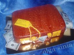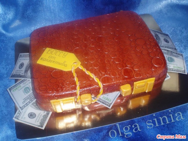 Это мой первый чемоданчик. Заказывали небольшой, но кажется такие тортики смотрятся когда они побольше. Внутри шоколадный шифон с крем-брюле и коньячной пропиткой.,2,5 кг. Шокомастика, доллары вафельные съедобные.