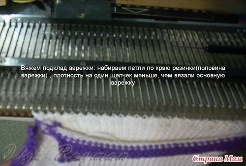 Начинаю вязать с мыса подклада, прибавляя в каждом 2-м ряду по 1 петле сдвух сторон, пока не выйду на нужную ширину варежки.