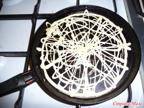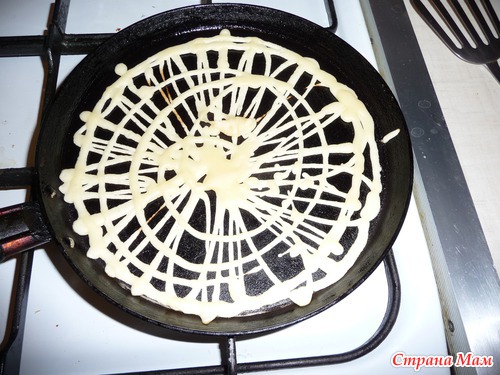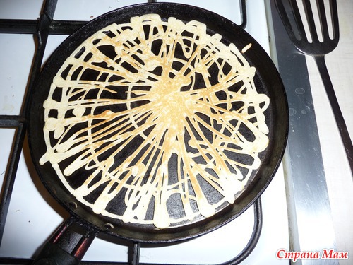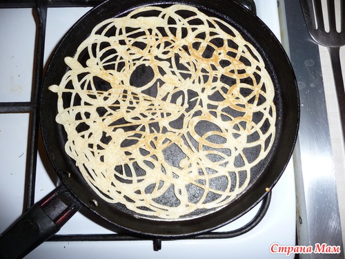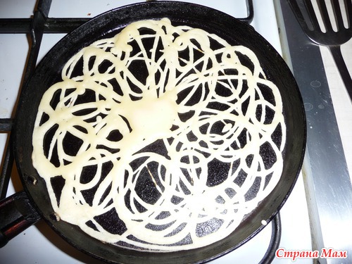 Выливать ажурный блинчики можно при помощи кондитерского мешка с самой маленькой насадкой или просто из пакета для молока, сделав в уголочке маааленькое отверстие.