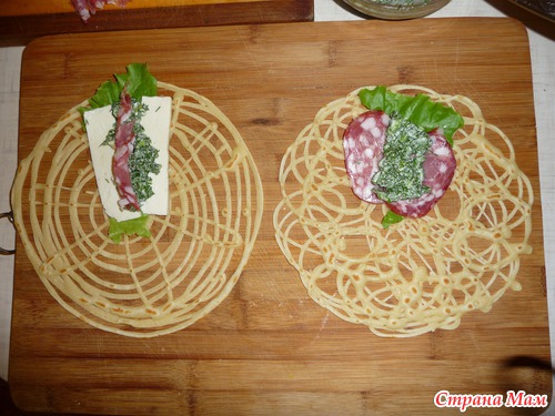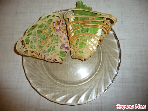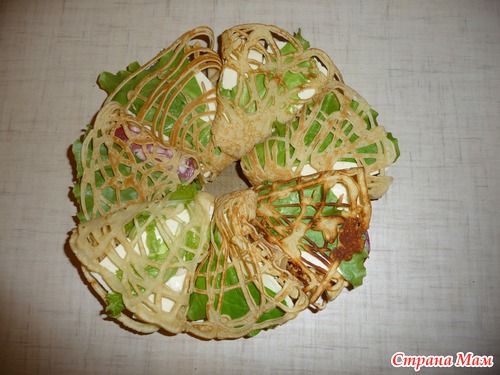 Для начинки ажурных блинчиков у меня были салатные листья. брынза, укроп+перья лука+майонез и ветчина.