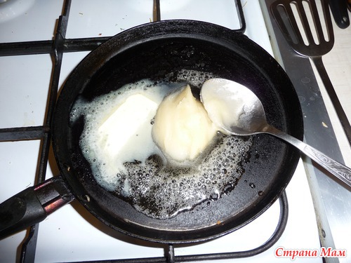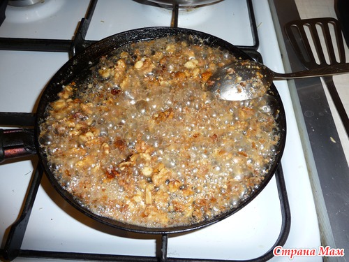 Мед и масло растопила на сковороде, добавила грецкие орехи и несколько ложек коньяка.