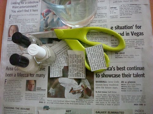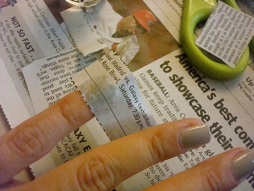 Вырежьте из газеты 10 полосочек с текстом, которые вы будете использовать. Вы можете поступить следующим образом: капнуть немного спирта на полосочку газеты и приложить ее к ногтю или же мокнуть ноготь в спирт на 5 секунд. Пока спирт не высох, быстро приложите газету на 20 секунд.