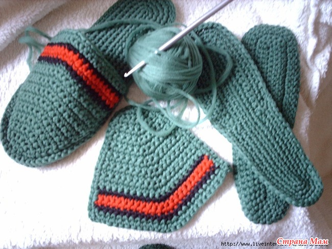 С вязывая их вместе, в средину ложу стельку и чего-нибудь жесткого, например можно вырезать стельку из пластиковой бутылки ( она не даёт подошве безучастно провисать и держит тапочек в форме)
