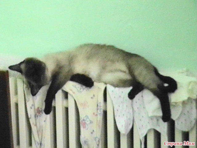А вторая кошку уж очень теплолюбивая была. Той зимой сын был совсем маленький, соответственно и стирки очень много (подгузниками я не пользовалась). Так моя киса постоянно спла на батарее на детской одёжке. Как только мы ее не гоняли, а она с одной комнаты в другую переходила