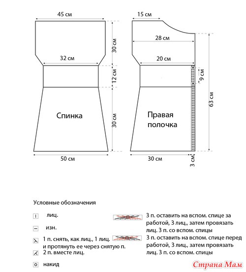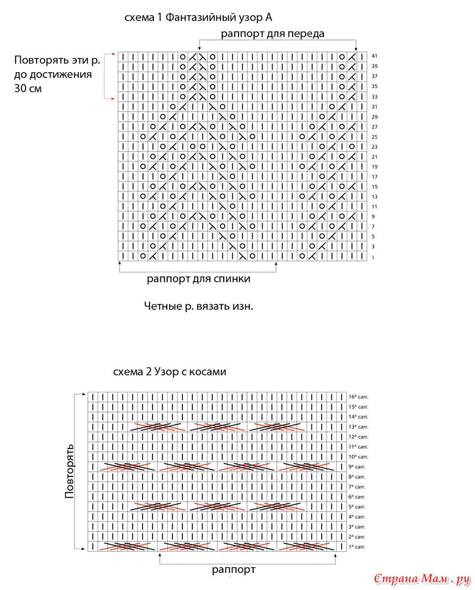 Правая полочка: на спицы №4 набрать 64 п. и вязать 4 р. платочной вязкой. Перейти на вязание фантазийным узором А по схеме 1, повторяя раппорт для полочек и провязывая первые 7 п. платочной вязкой для формирования планки. На высоте 30 см от начала вязания перейти на вязание узором с косами по схеме 2. На высоте 32 см от начала вязания вывязать первое отверстие для пуговицы на расстоянии 4 п. от края, второе - на расстоянии 9 см от первой. 3-е и четвертое отверстия не вывязывать, а сделать, раздвинув петли узора. На высоте 42 см от начала вязания перейти на вязание фантазийным узором В, прибавив с левой стороны в каждом 2-м р. 4 раза по 1 п. На высоте 63 см от начала вязания для выреза горловины закрыть с правой стороны в каждом 2-м р. 1 раз 8 п., 1 раз 4 п., 3 раза по 3 п., 1 раз 2 п. и 8 раз по 1 п. На высоте 30 см от начала вязания фантазийным узором В все п. закрыть.