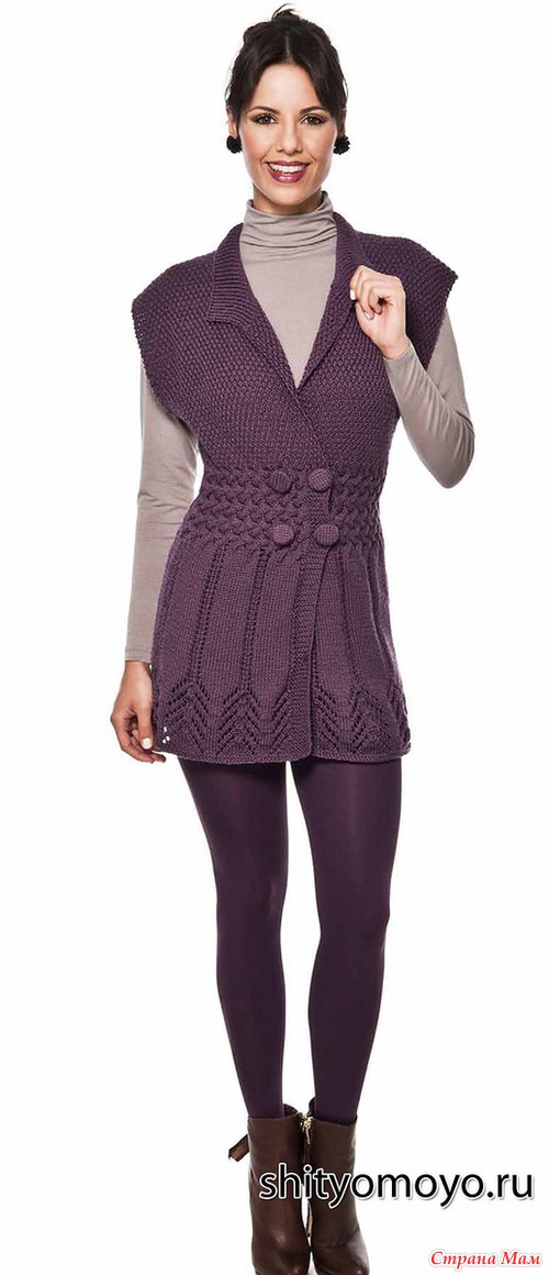 Ажурная фиолетовая туника связана спицами из полушерстяной пряжи двумя фантазийными узорами и стягивающим узором с косой на линии талии.