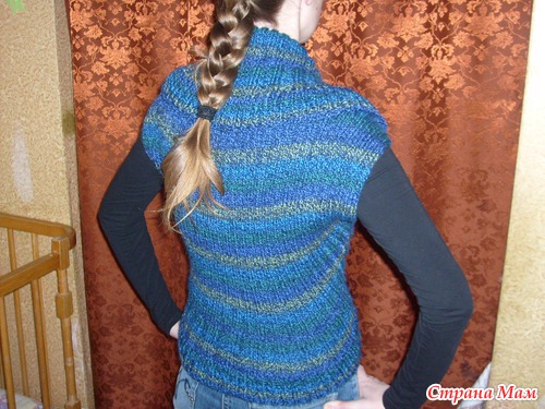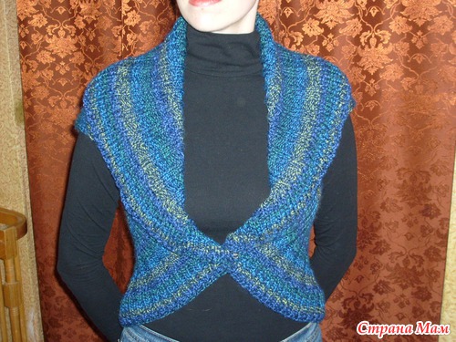 На размер 42-44 итальянским способом набрать 144 петли и связать прямоугольник размером 84*60 резинкой 2*2. Затем перейти на резинку 3*3 ( 5 см.), а потом - на английскую (6 см.) и закрыть петли. Снизу добрать петли и довязать аналогично верху тройную и английскую резинку. Сложить пополам и, отступив от линии сгиба 17 см., сделать по обеим сторонам по одному шву. Получились проймы для рукавов. При надевании верхнюю часть отогнуть наружу в качестве воротника.