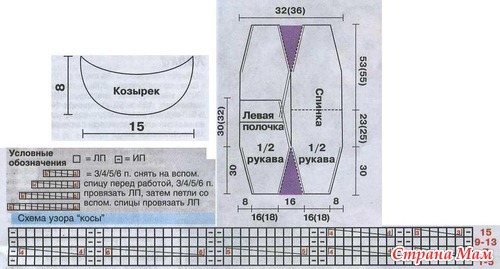 Плотность вязания. 20 п. и 38 р. = 10 х 10 см, связано основным узором; 46 п. и 26 р. = 19 х 10 см, связано узором "косы".