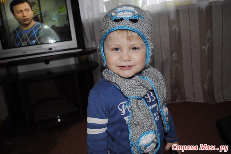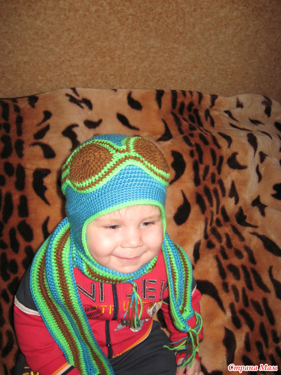 Свяжите самолетик по схеме 2. Готовую деталь самолетика обвяжите соед. столбиками и пришейте его на шапочку. Прикрепите глаза.