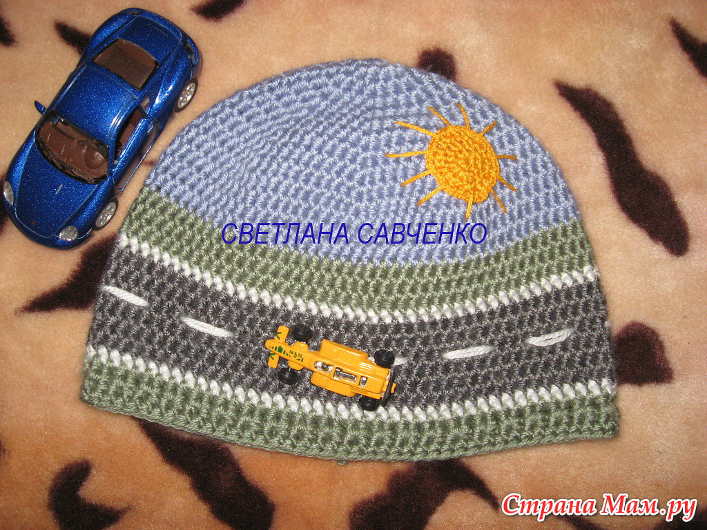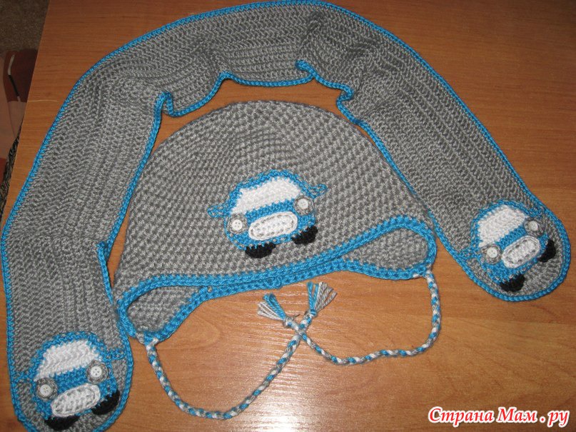 Для завязок скрутите шнурок из трех нитей, пришейте к «ушкам». Свяжите машинку, колеса и фару по схеме 2, пришейте на шапочку.