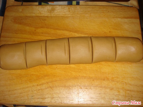 затем раскатываем колбаску и режем на одинаковые 5 частей (на фото 6-увлеклась