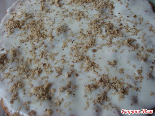 Коржи остыли, приступаем к формированию торта, намазываем корж кремом, я люблю в этом торте грецкий орех, поэтому сверху посыпаем чем понравится или оставляем только крем. Лучше подождать пока крем впитается и покрыть еще слоем крема.